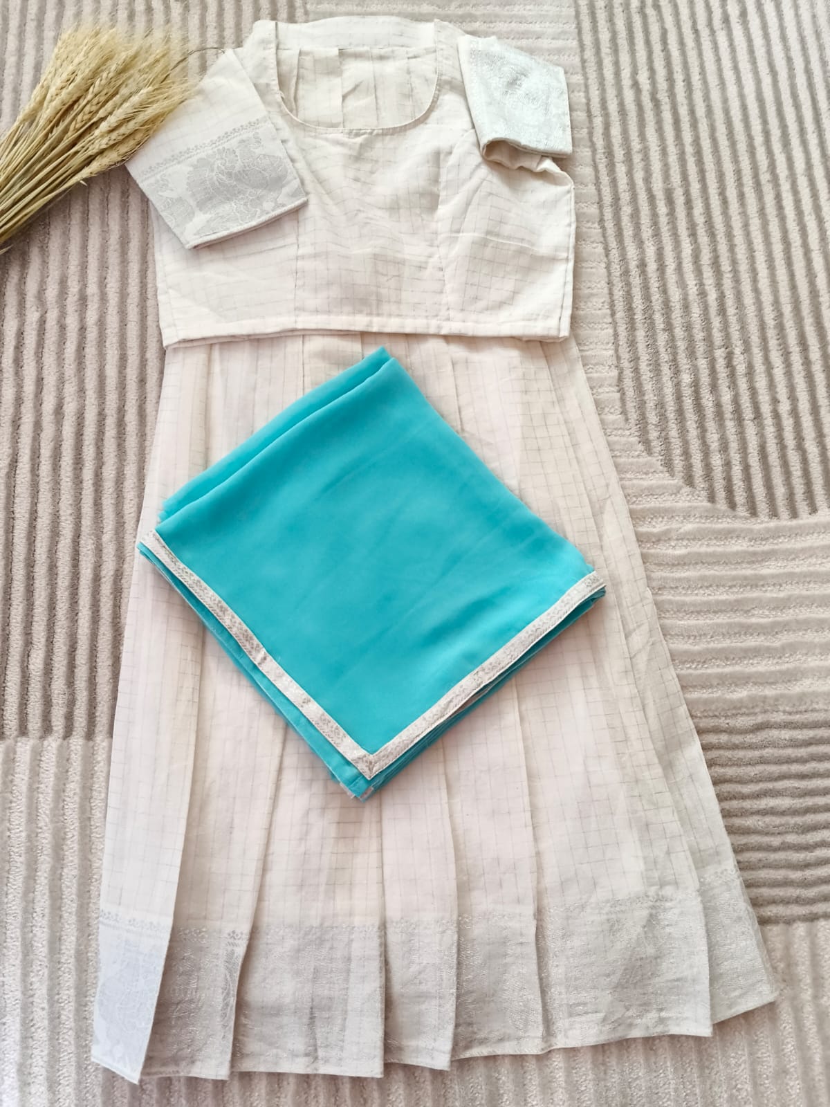 White with Rich Silver Border Half Saree With Light Sky Blue Dupatta